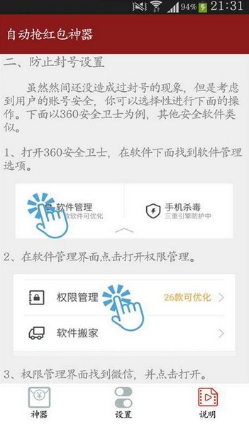 红包外桂作弊器是一款超强的qq微信抢红包辅助应用,利用红包外桂作弊器不仅轻松控制发红包尾数,查看红包尾数大小抢最佳,红包外桂作弊器还能智能埋雷避雷,在各类红包群中完美玩转抢红包。 功能介绍 红包外桂作弊器尾数还可以控制红包尾数,方便实用,红包外桂作弊器是你抢红包的必备软件. 并且红包外桂作弊器安卓版拥有锁屏自动红包提醒,自动抢红包,一键开关该功能 红包尾数自由控制,独家玩法来袭 红包外桂作弊器是你红包游戏的神器。 红包外桂作弊器帮你赢取很多的红包金额。 红包外桂作弊器操作非常简单,方便上手,让你轻松在红包游戏中独占鳌头。 1.自动抢红包 无人值守秒杀微信红包 2.自定义回复感谢语 抢完红包之后记得说声谢谢哦 3.个性化的排行榜 抢红包也能当第一 4.小巧实用 是目前最简单干净、最受大众喜爱、好评率最高的自动抢红包神器 5.一键加速 清理内存,手机更快才能更好的抢红包 软件特色 1.自动抢红包速度超快,锁屏也能抢。 2.支持红包群互换,增加红包数量。 3.有自动回复功能,防踢,还可以延迟。 4.智能红包过滤,想抢哪个自己作主。 5.防封号库,能有效避开各种封堵、拦截,更安全 更新日志 1、优化细节问题。 2、抢包功能更快更稳定。