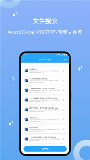 查找存储空间中的world、Excel、ppt、pdf、文本文档、压缩包、安装包等一系列文件。可以进行导出操作。