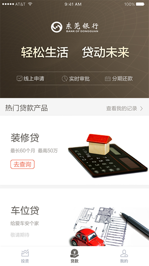 东莞银行直销银行app是本行为客户精心打造的移动金融服务平台。东莞银行直销银行app不仅为您提供传统的财富与投资理财服务,还为您提供装修贷、车位贷等普惠金融线上贷款服务,线上操作、线上审批、分期还款,致力于做您身边的银行。