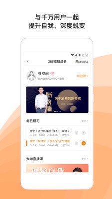 每日能量指引、女性赋能课、每周主题直播、海量有声书、大师课等课程免费学,还可参与线下工作坊、幸福研习活动、互动学习社群等。